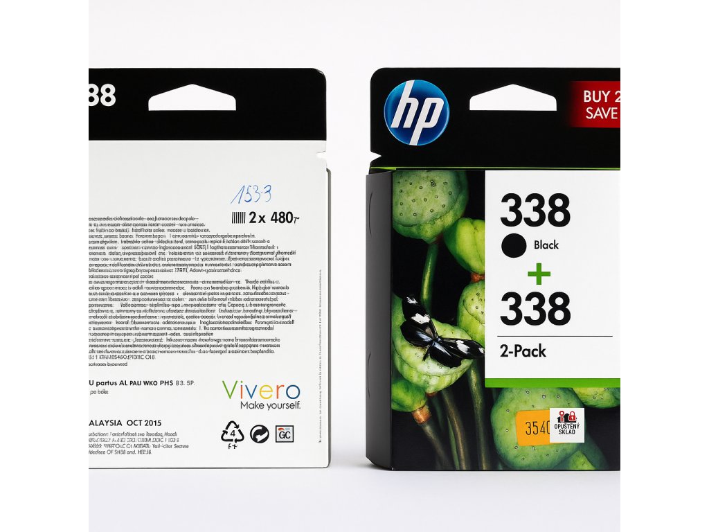 Originální černé inkoustové kazety HP 338 v původním balení – bazarové zboží z přebytků skladu. Výhodná volba pro nenáročný tisk nebo testování zařízení.